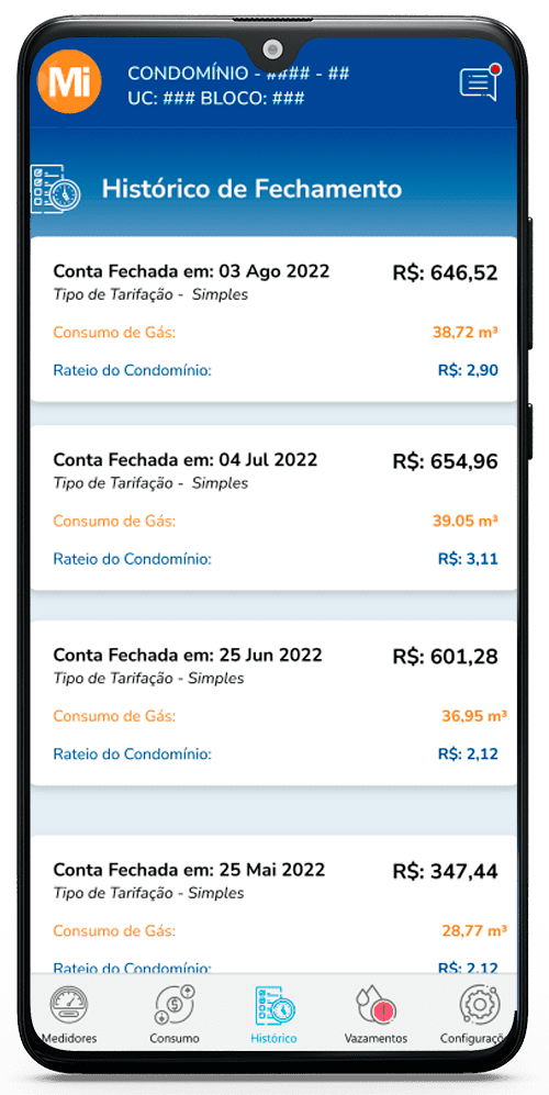O aplicativo armazena um histórico dos seus fechamentos, informando o volume consumido e o valor em reais.